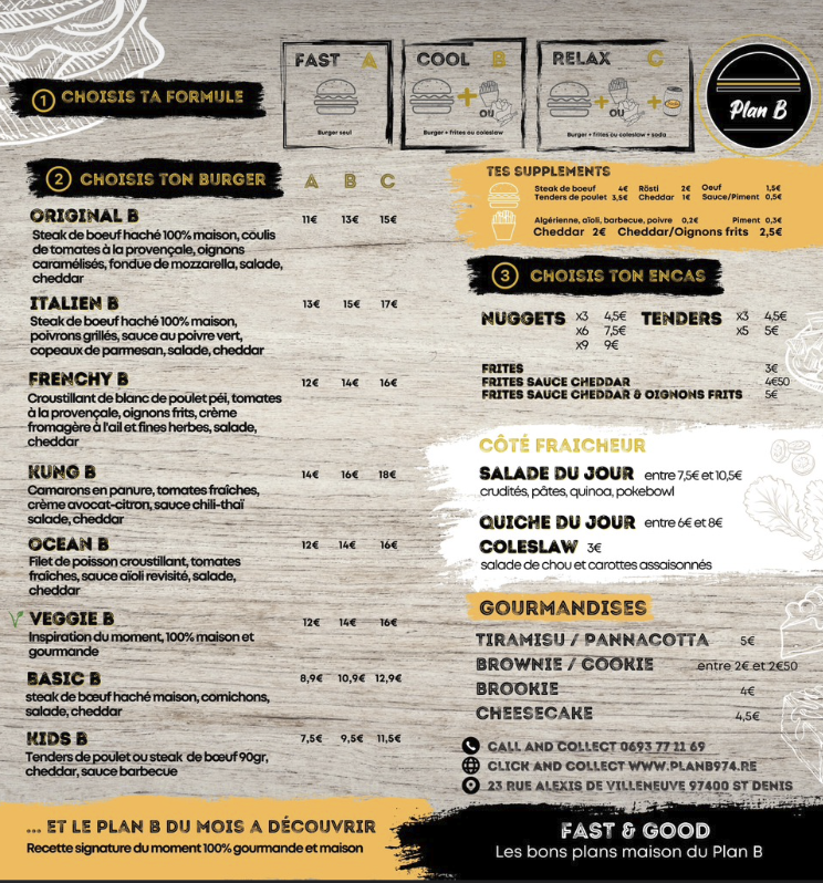 Bar à burgers, nuggets, tenders, quiches et desserts, le plan B 974 propose de très bons burgers.